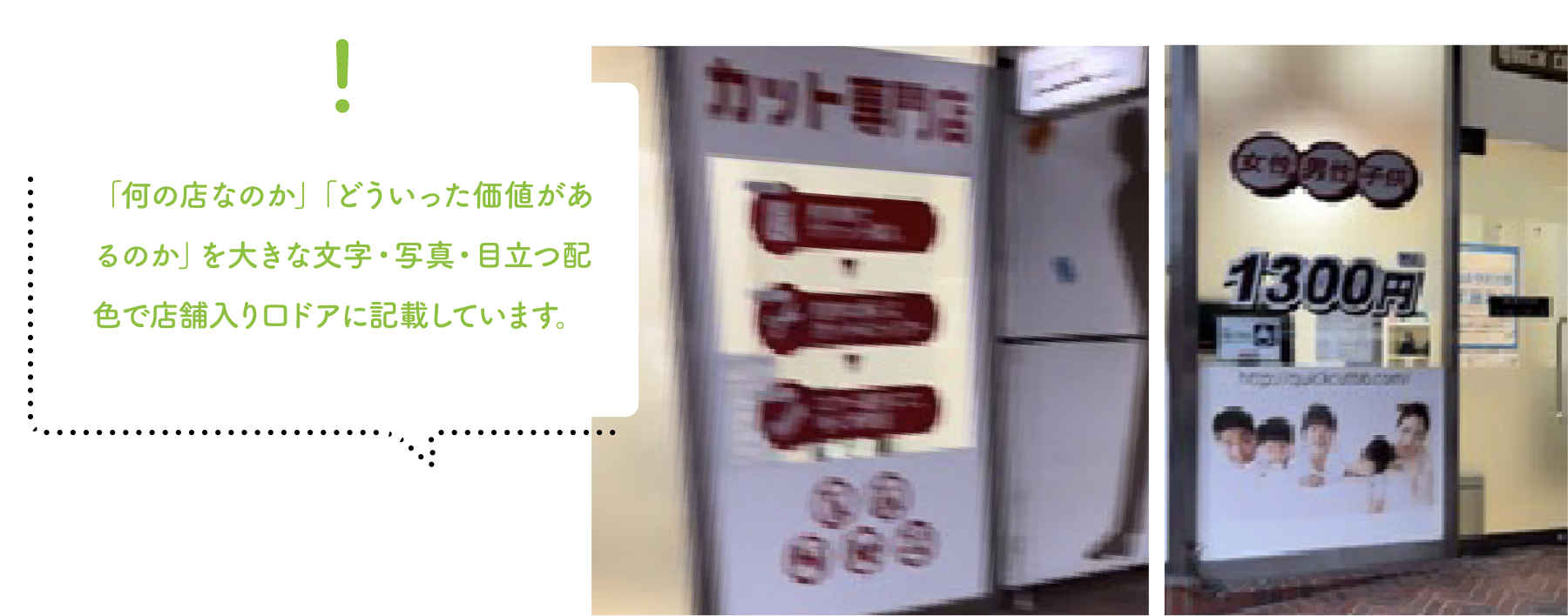 やはり、自分の店のサービスや店名を目立たせてアピールしている店が多いことがわかります。こちらは商店街なので、お客さんは「買い物」や「食事」を目的として通過します。通過するお客に向けて、興味を持ってもらうために、A看板やディスプレイを設置したり、のぼりを立てたりしています。お客さんにとって気になるものがあれば、その日の来店は無くても「次の来店チャンスに繋げる」ということも考えられます。